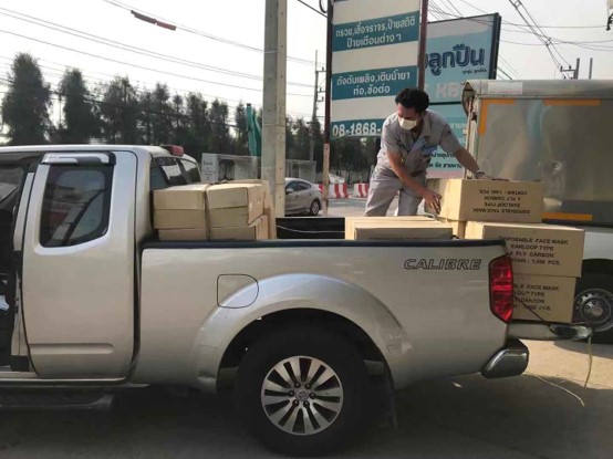 在疫情爆發(fā)的時刻,泰國分公司的員工在副總經(jīng)理莫宏敏動員下,采購人員電話聯(lián)系所有商家和藥店采購防護用品。面對泰國當(dāng)?shù)匾渤霈F(xiàn)防護用品搶貨的情況下,依然買到防護服1000套、醫(yī)療手套10000雙、護目鏡700副、防護口罩20000只、醫(yī)用防護帽10000只。