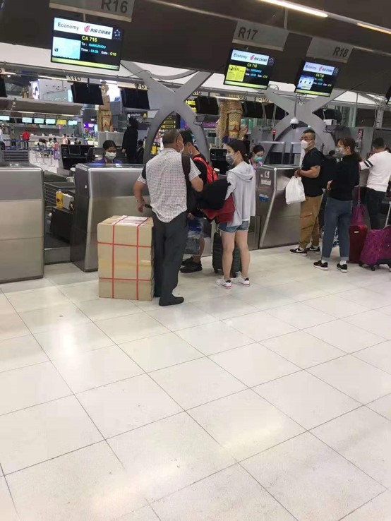 1月30日,由泰國公司總經(jīng)理孟祥耀負責(zé)將此批口罩送往機場送回國內(nèi)。但由于飛機限重、起飛時間緊迫等原因,一時間無法將所有口罩運上飛機。最后他們不得已在機場動員此次航班的旅客幫忙攜帶救援物資,直到凌晨,所有口罩已全部搭上飛機,飛往杭州。為他們的機智點贊!