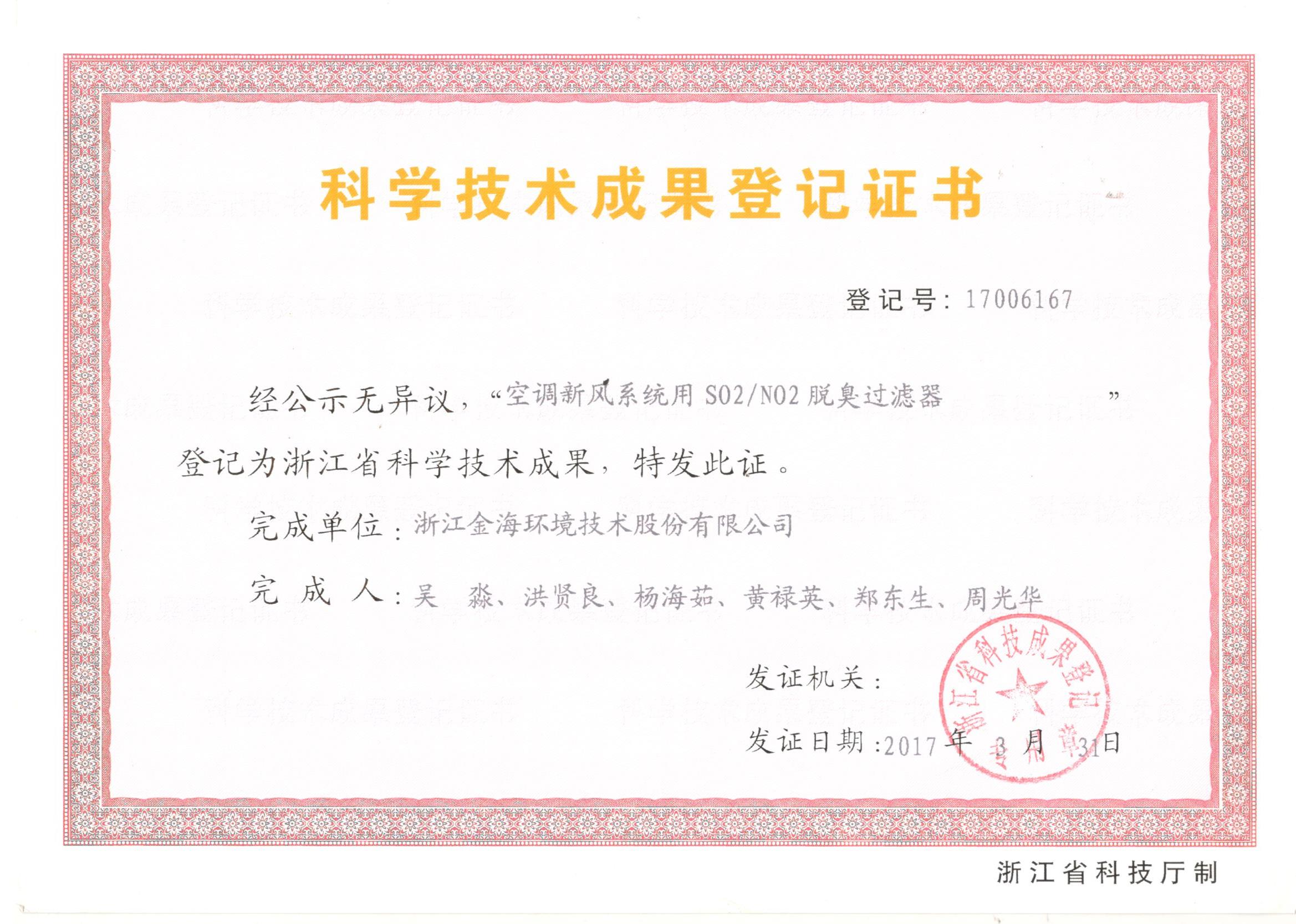 空調(diào)新風(fēng)系統(tǒng)用S02/N02脫臭過(guò)濾器科學(xué)技術(shù)成果登記證書