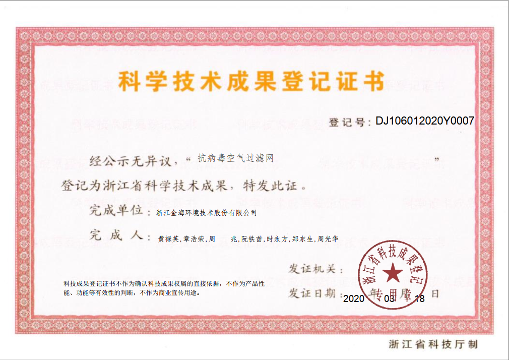 抗病毒空氣過(guò)濾網(wǎng)科學(xué)技術(shù)成果登記證書