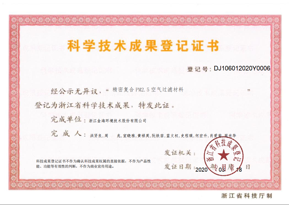 精密復(fù)合PM2.5空氣過(guò)濾材料科學(xué)技術(shù)成果登記證書