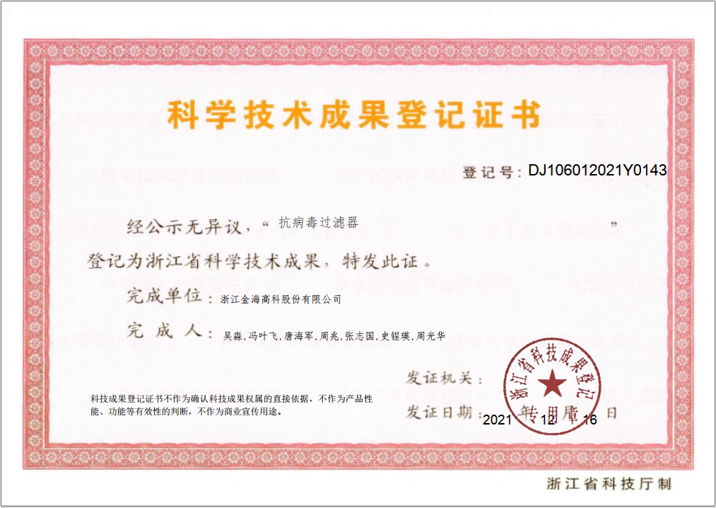 抗病毒過(guò)濾器科學(xué)技術(shù)成果登記證書