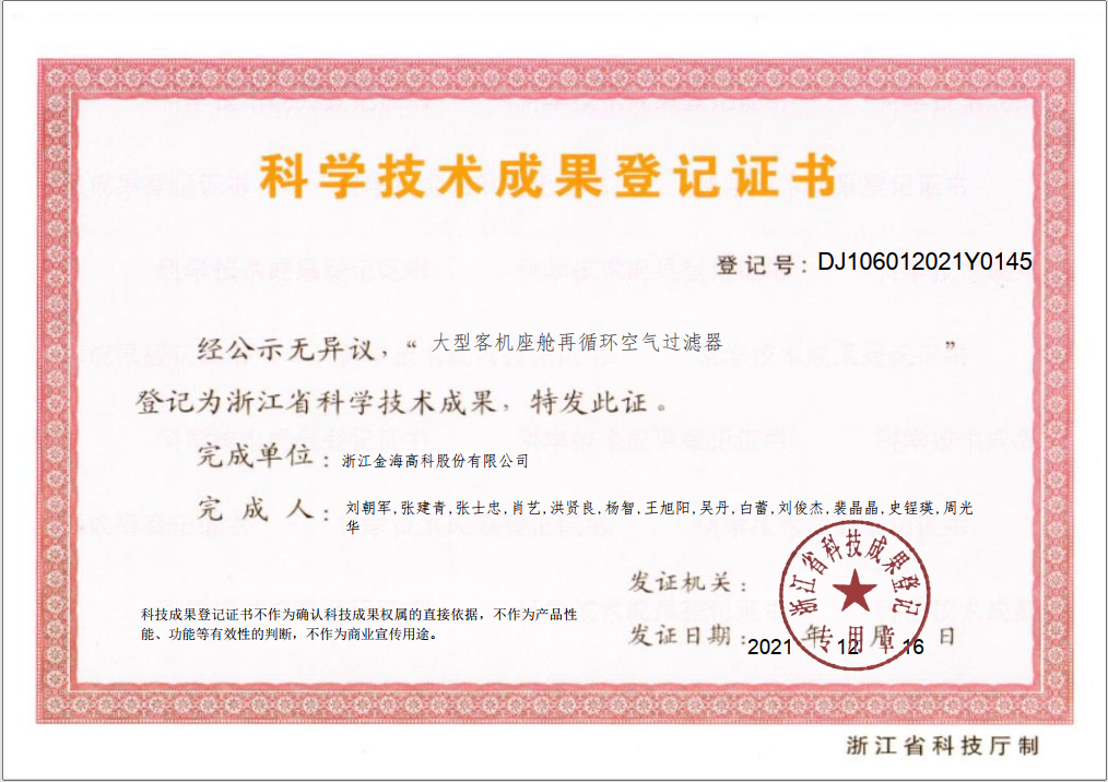 大型客機(jī)座艙再循環(huán)空氣過(guò)濾器科學(xué)技術(shù)成果登記證書