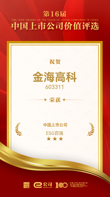 金秋送爽,瓜果飄香,這是一個到處充盈著收獲和喜悅的季節(jié)。近日,由證券時報主辦的第十六屆中國上市公司價值評選經(jīng)過層層選拔及公開投票,獲獎名單正式揭曉,金海高科斬獲“中國上市公司ESG百強(qiáng)”獎!這是繼2021年獲得第十五屆中國上市公司價值評選社會責(zé)任獎后,對金海高科在社會責(zé)任、公司治理和綠色環(huán)保等方面的優(yōu)異表現(xiàn)再次高度肯定,更給予了全公司繼續(xù)貫徹ESG理念推動企業(yè)高速、健康發(fā)展極大的鼓勵。