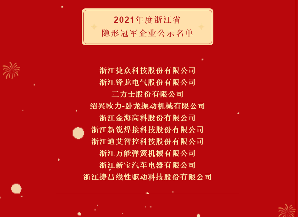 農(nóng)歷新年將至,四處洋溢著濃濃的年味兒,金海高科作為環(huán)保、空濾行業(yè)的龍頭企業(yè),在這一年中最熱鬧喜慶的時候,憑借著突出的行業(yè)地位及豐碩的科研成果,當選由浙江省經(jīng)濟和信息化廳主導(dǎo)評選的2021年度浙江省隱形冠軍企業(yè),為即將到來的虎年春節(jié)增添了更多歡樂氣氛。