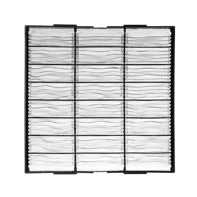 該過(guò)濾網(wǎng)板為折疊結(jié)構(gòu),通過(guò)注塑模具塑料成型,固定折間距和高度,有效增加空氣過(guò)濾面積,同時(shí)可以根據(jù)空調(diào)設(shè)計(jì)風(fēng)量選擇不同密度、不同功能的過(guò)濾網(wǎng)??赏瓿烧鄹邚?mm~35mm折濾網(wǎng)生產(chǎn),計(jì)重效率根據(jù)濾網(wǎng)不同,效率可以從選擇40%~80%,并可復(fù)合抗菌防霉、阻燃、負(fù)離子、抗病毒等多種功能