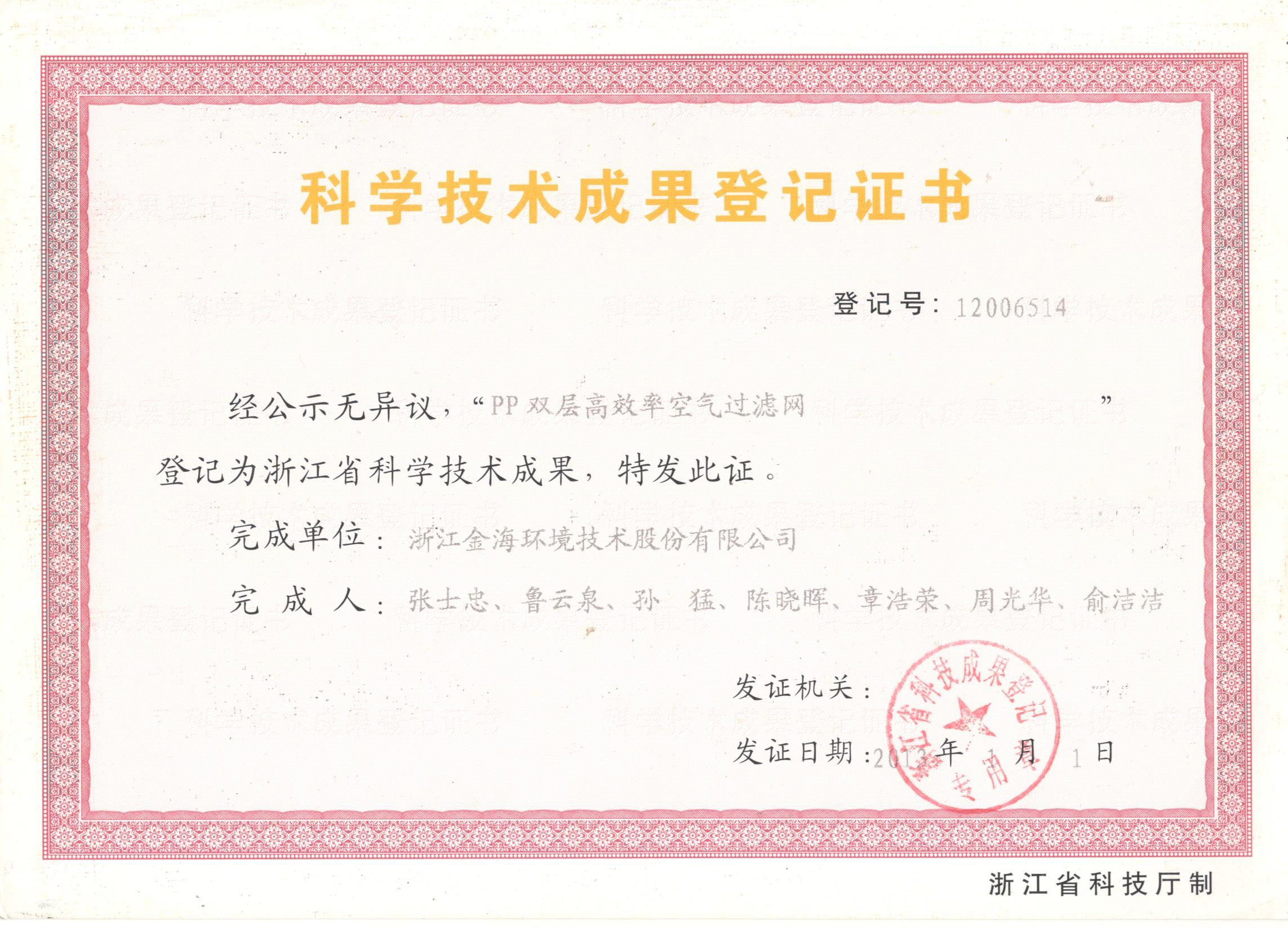 PP雙層高效率空氣過(guò)濾網(wǎng)科學(xué)技術(shù)成果登記證書
