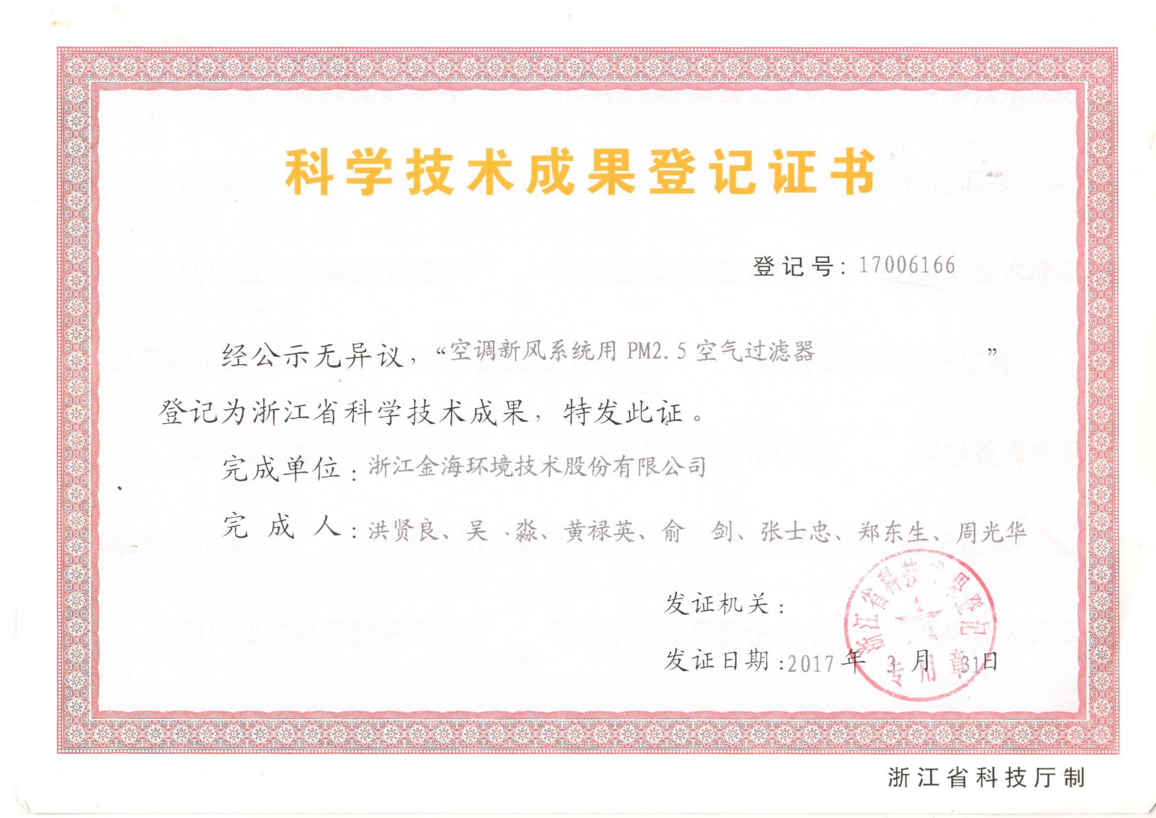 空調(diào)新風(fēng)系統(tǒng)用PM2.5空氣過(guò)濾器科學(xué)技術(shù)成果登記證書
