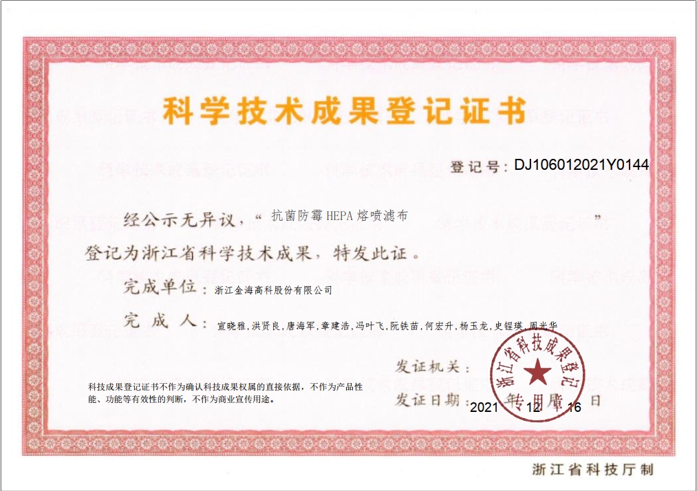 抗菌防霉HEPA熔噴濾布科學(xué)技術(shù)成果登記證書
