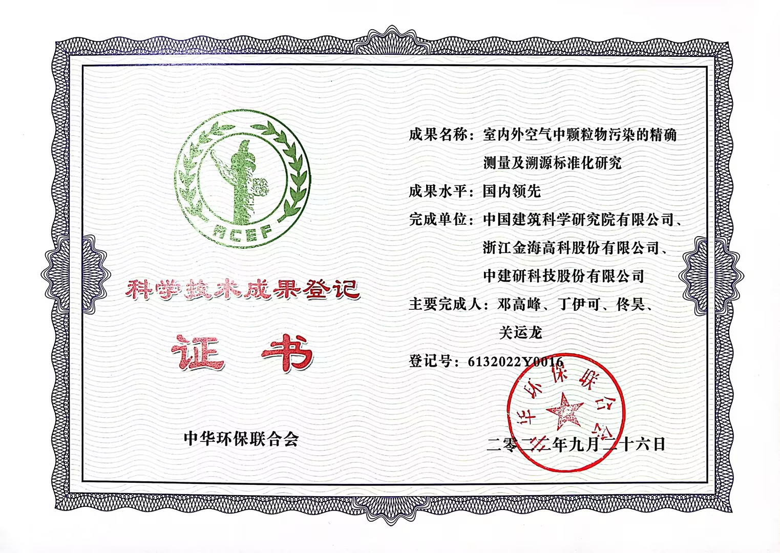 室內(nèi)外空氣中顆粒物污染的精確測(cè)量及溯源標(biāo)準(zhǔn)化研究科學(xué)技術(shù)成果登記證書